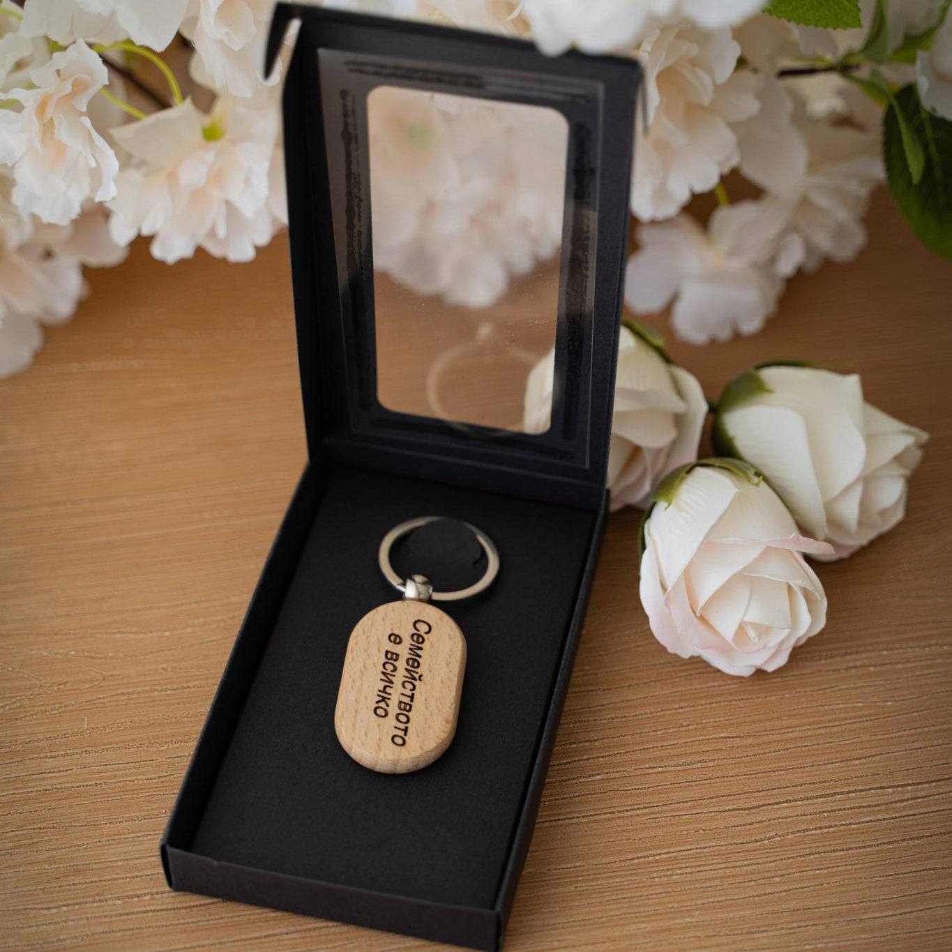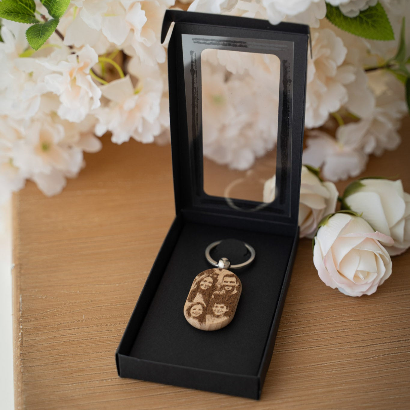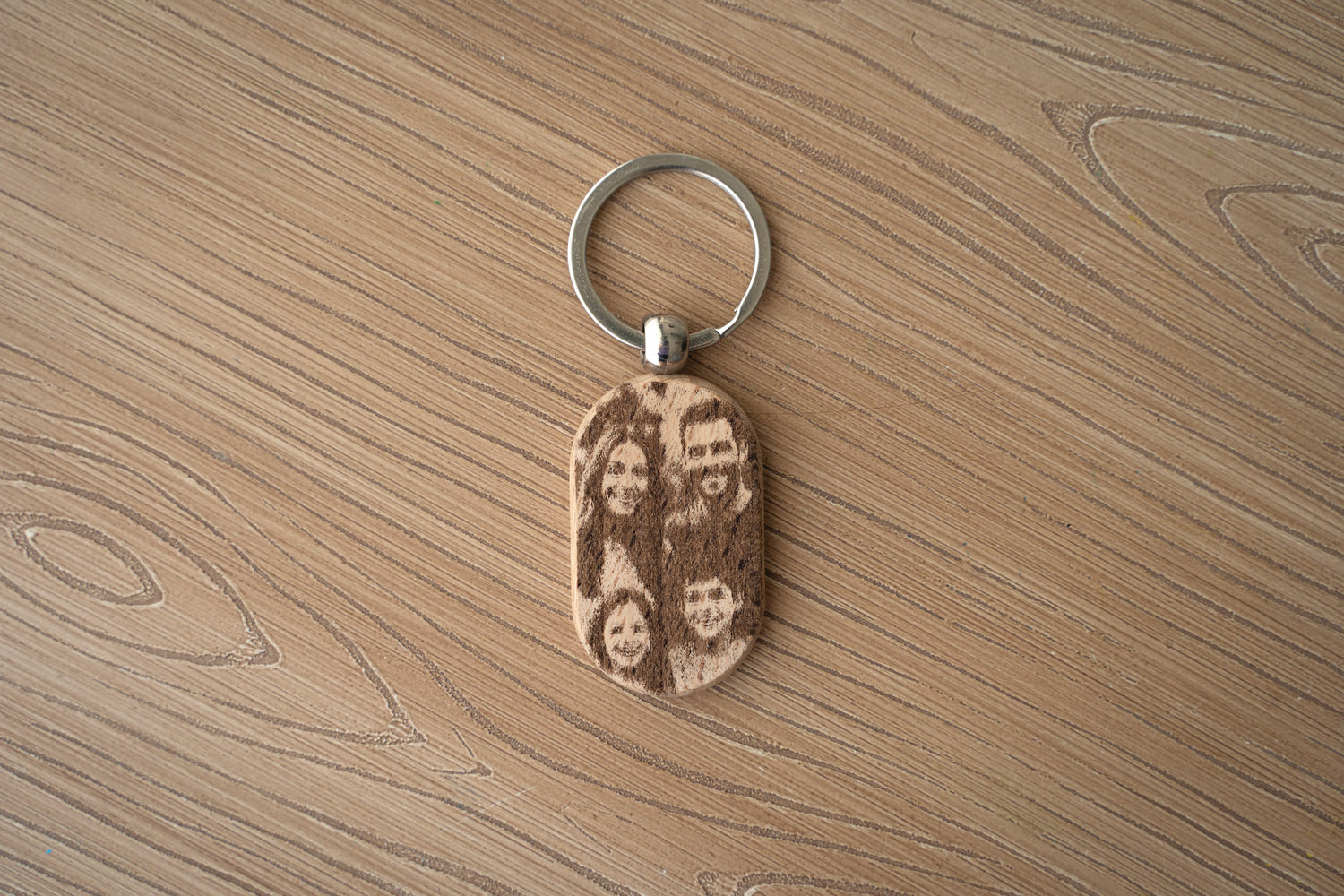 Това е персонализиран дървен ключодържател, ръчно изработен и гравиран по Ваша снимка. Идеален е като сантиментален подарък или декорация, която съхранява ценни спомени.